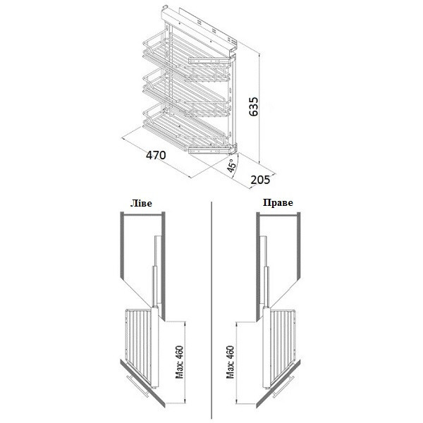 Карго Starax 250 3 полки 45° полного выдвижения на тандемах Blum хром левое (правое креп.) S-2201-C