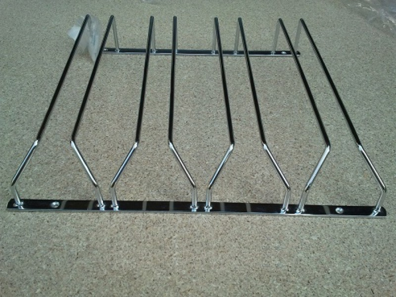 Келихи розташовані догори ногами, з легкістю входять і опускаються на два паралельних прутка, задня частина менш широка і завдяки цьому келихи зафіксовані.Так як кріплення покрито хромом, келихи не будуть дряпатися і пошкоджуватися.