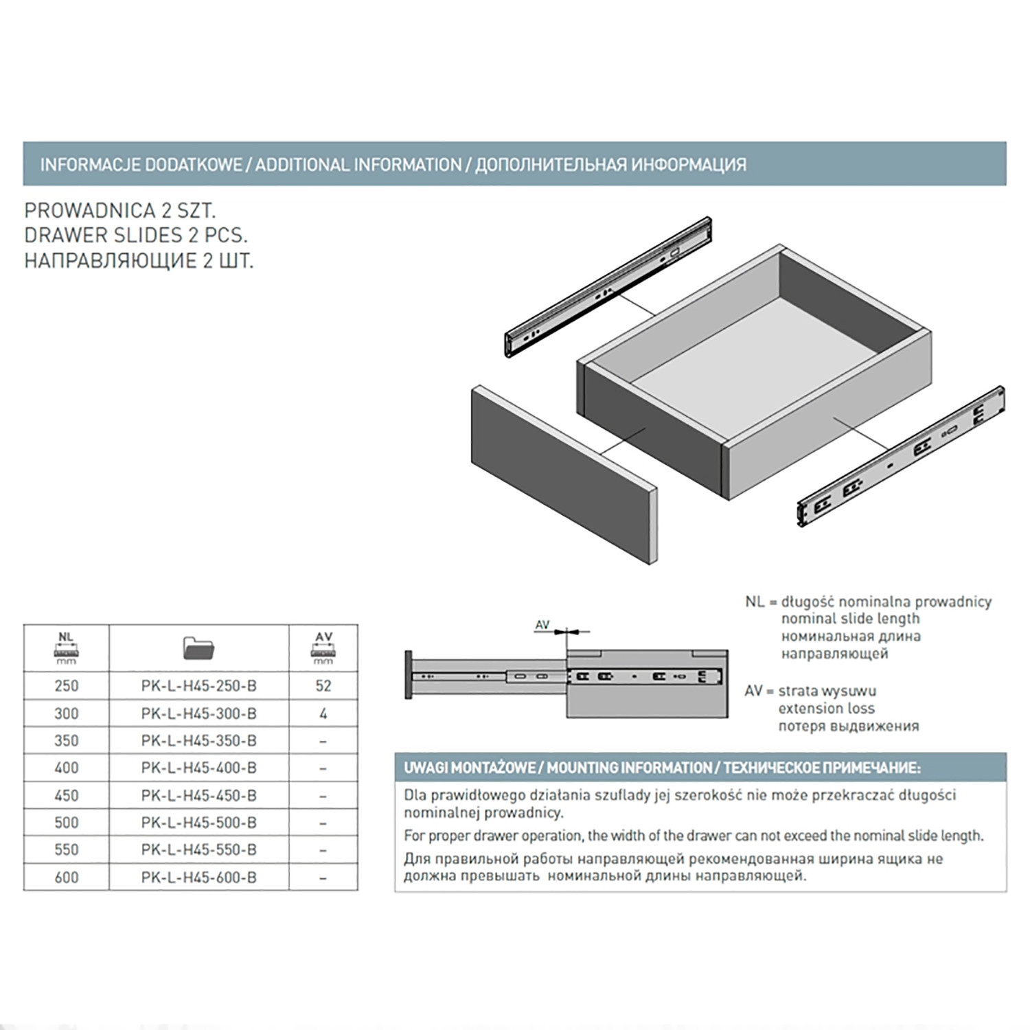 Висока вантажопідйомність. Зручний механізм дозволяє легко встановлювати і знімати ящик. Можливість установки кулькових направляючих замість роликових без зміни розмірів ящіка. Легке відкривання навіть при максимальному заповненні ящика.