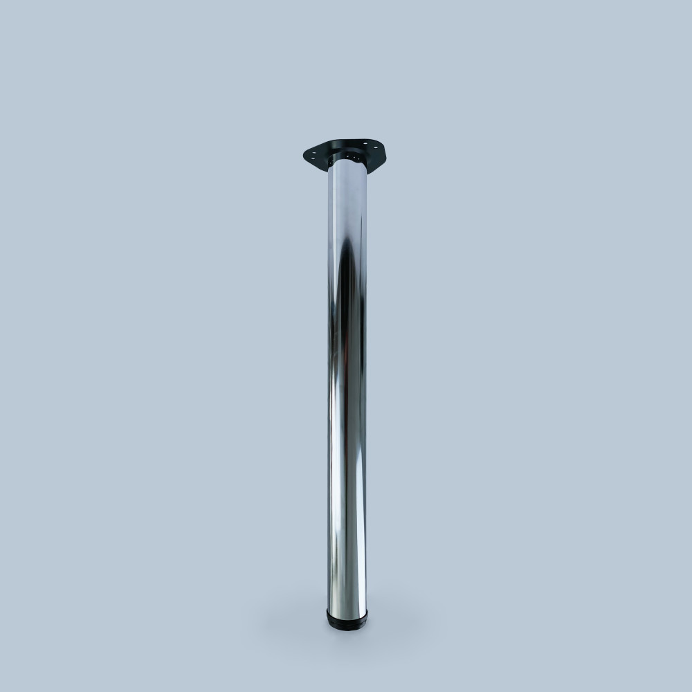 Нога для столу регульована по висоті, стаціонарна, універсальна; сталева, хромована з верхнім кріпленням (майданчик).