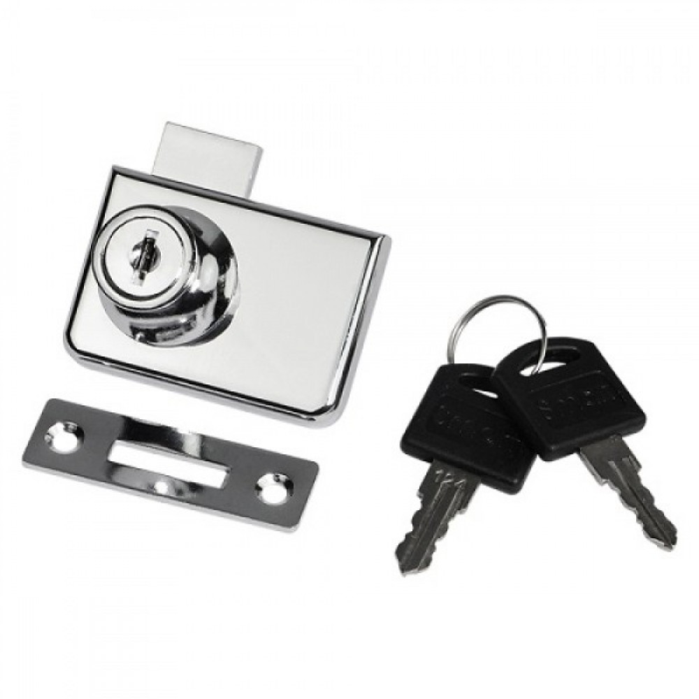Замок з простим механізмом запирання використовується для складання меблів з суцільноскляними створами товщиною до 8 мм. Для кріплення передбачений двоточковий гвинтовий затиск зі спеціальними підкладками-ущільнювачами, щоб не пошкодити скло.