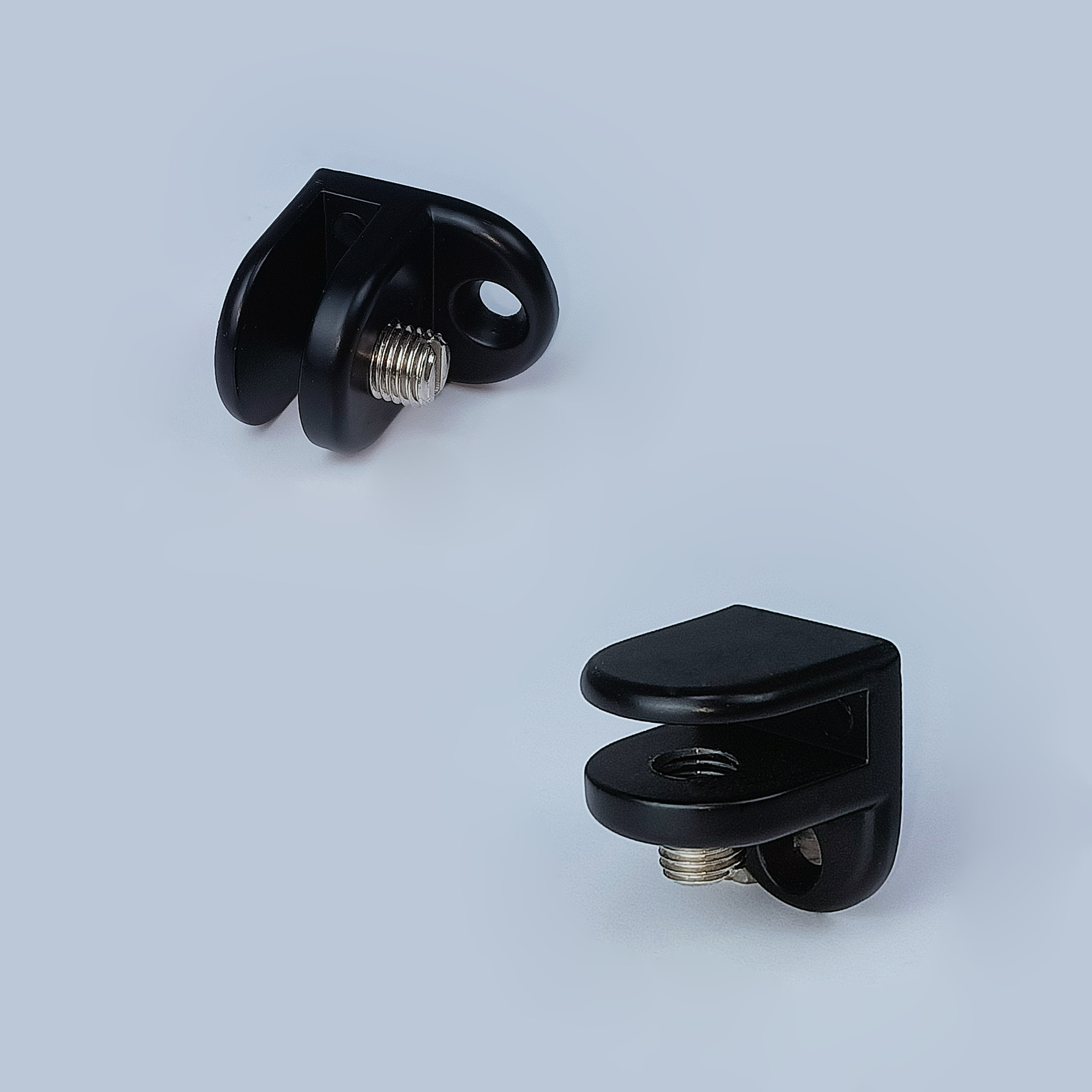 Практически ничем не отличаются от обычных полкодержателей стекла, имеют возможность регулировки для крепления стекла различной толщины, но в большинстве случаев, оборудованы резиновыми насадками в месте зажима стекла.