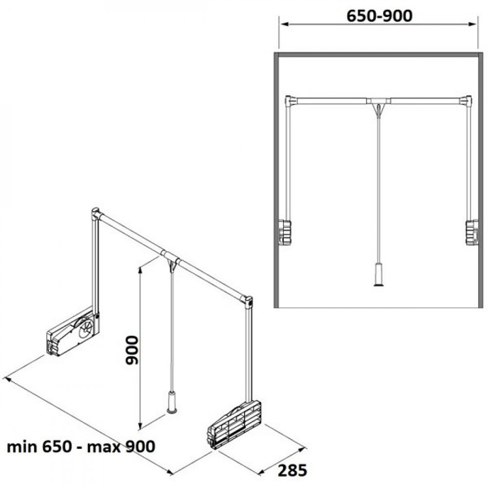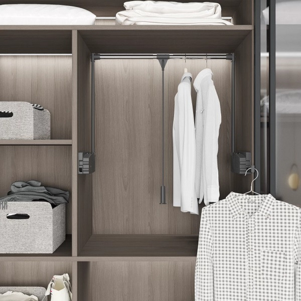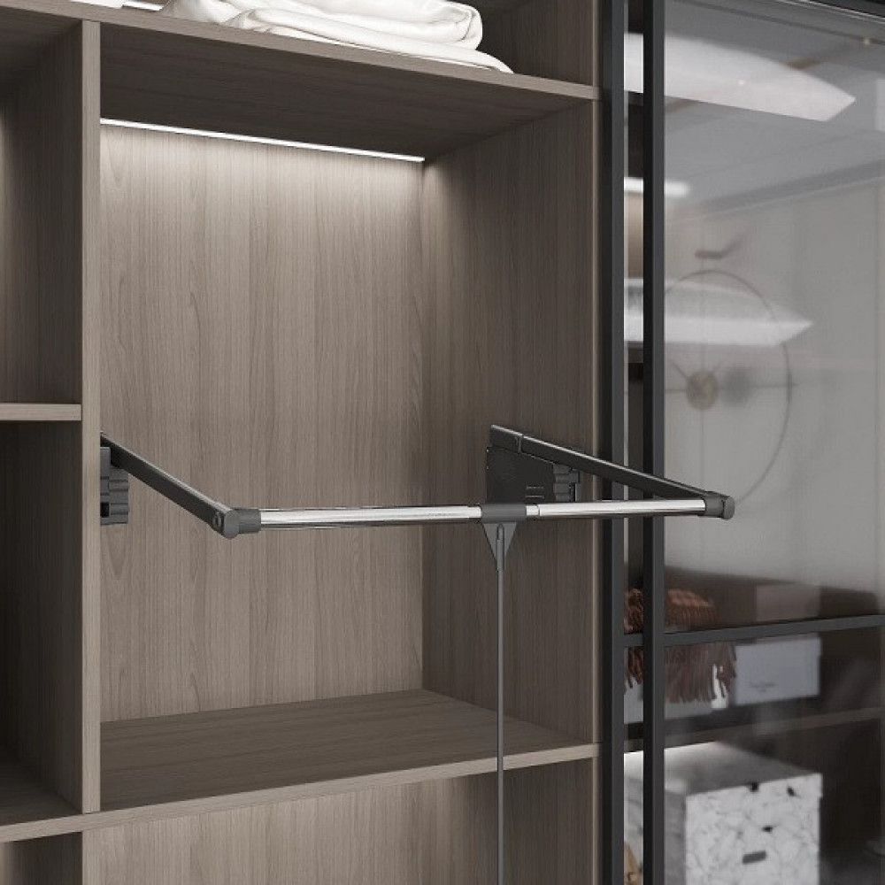Чаще всего он находит применение в шкафах-купе, хотя при желании может быть встроен куда угодно, в том числе и в шкафах с неполным раскрытием секции. Нагрузка 10кг. Для шуб или дублёнок рекомендуется выбирать механизм, выдерживающий от 15 кг.