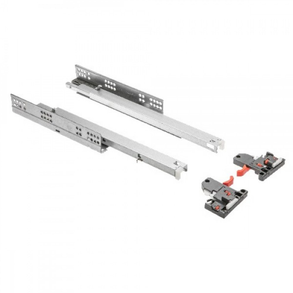 Допустимая нагрузка - 35 кг. Оцинкованная. Полное выдвижение. Легкий монтаж. Точная система тихого закрывания. Регулировка высоты фронта: + 3 мм. Рекомендуется монтаж, где ширина ящика не превышает номинальную длину направляющей.
