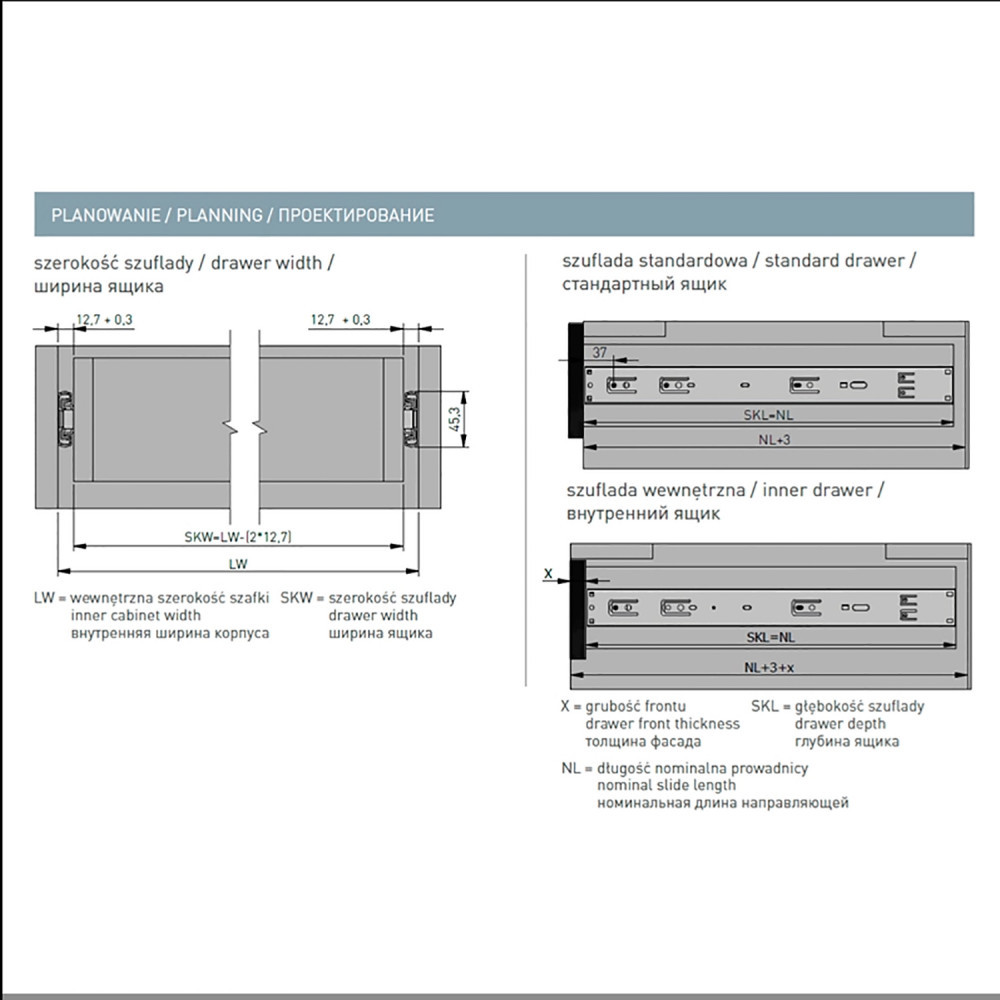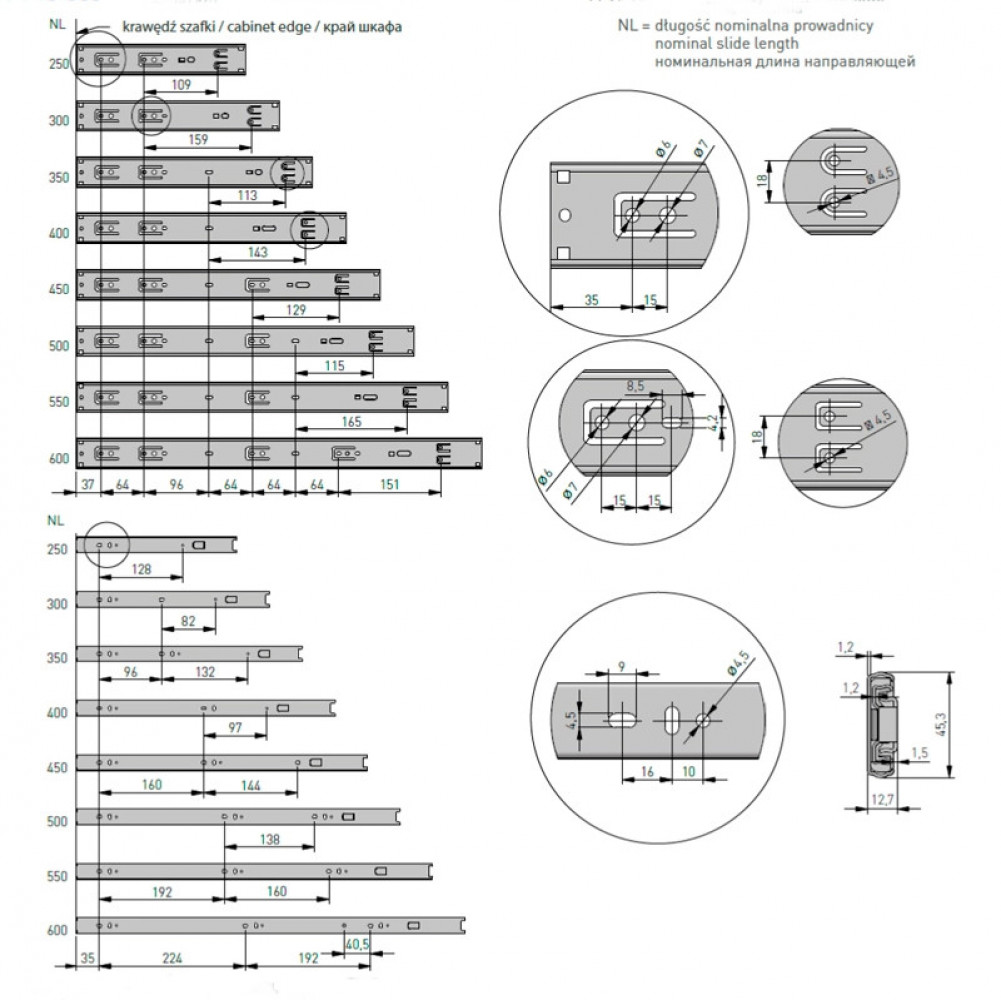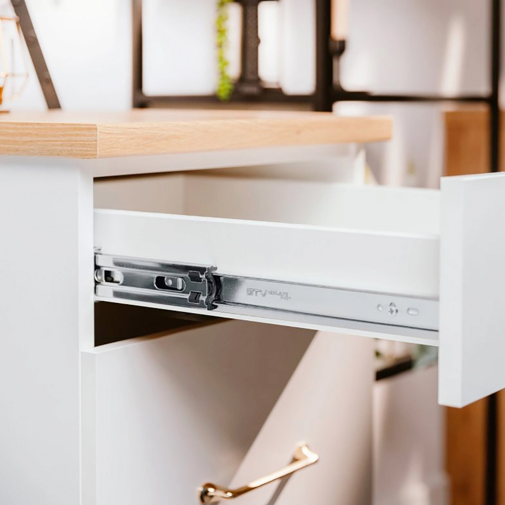 Высокая грузоподъемность. Удобный механизм позволяет легко устанавливать и снимать ящик. Возможность установки шариковых направляющих вместо роликовых без изменения размеров ящика. Легкое открытие даже при максимальном заполнении ящика.