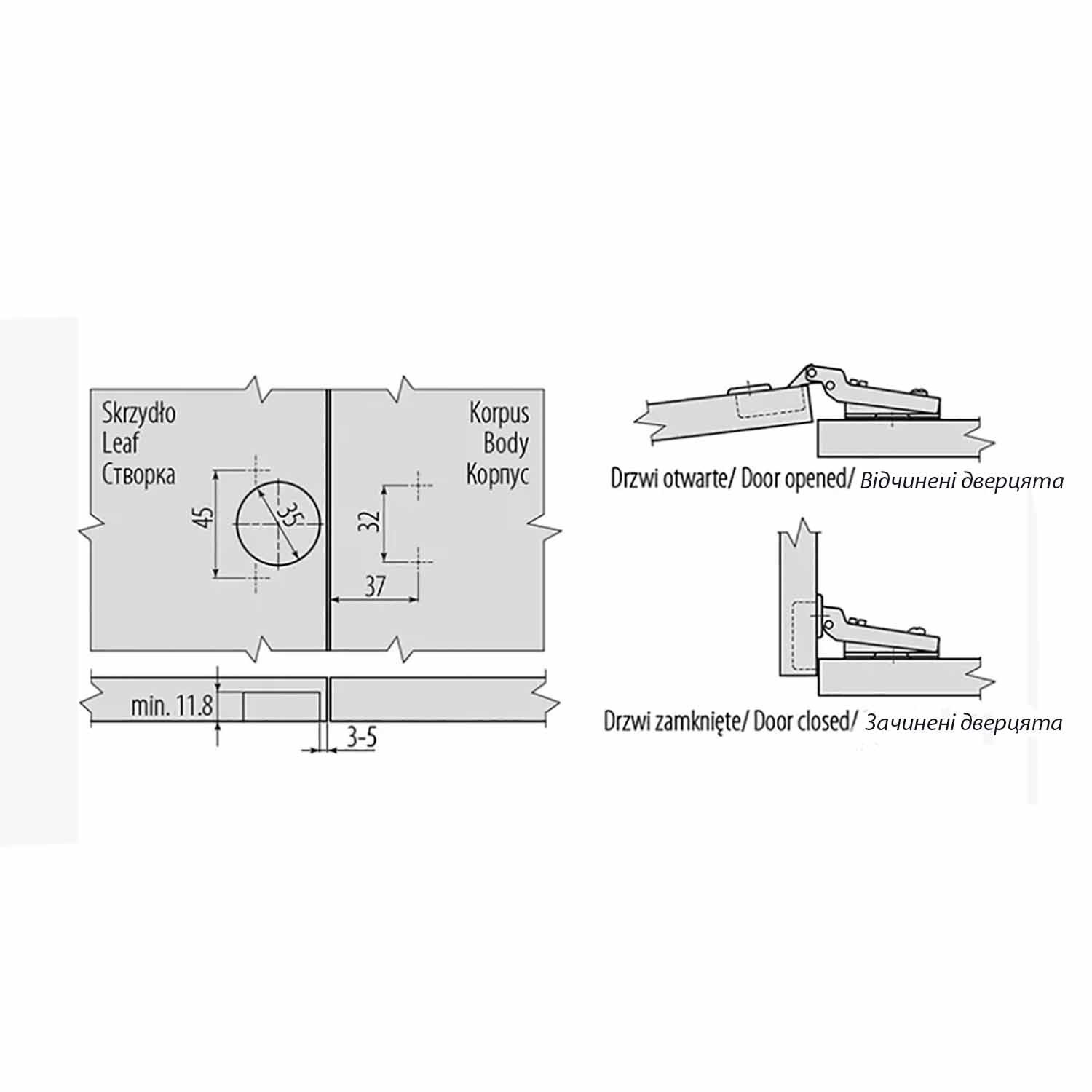 Полунакладные петли используют, если нужно на одну и ту же боковинку изделия прикрепить две дверцы. Петельная часть створки почти наполовину накладывается на торец соседней стенки, оставляя свободную часть торца для другой створки.