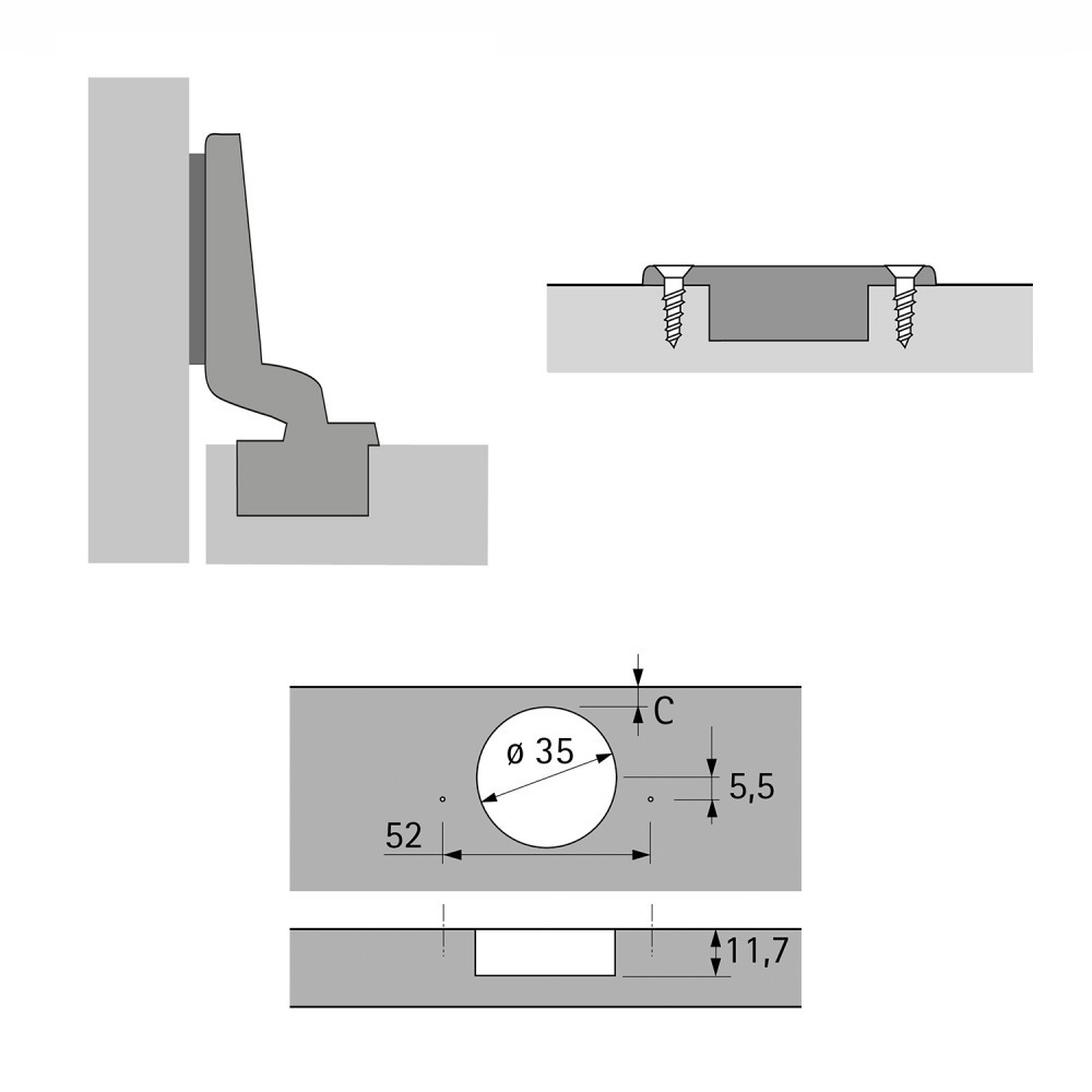 Тип монтажа:Clip-On Тип петли:для ДСП Тип закрывания:без доводчика Межцентровое расстояние, мм:52