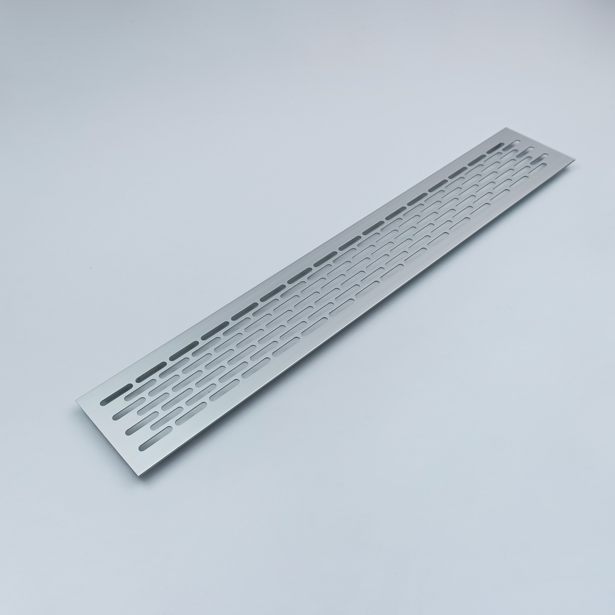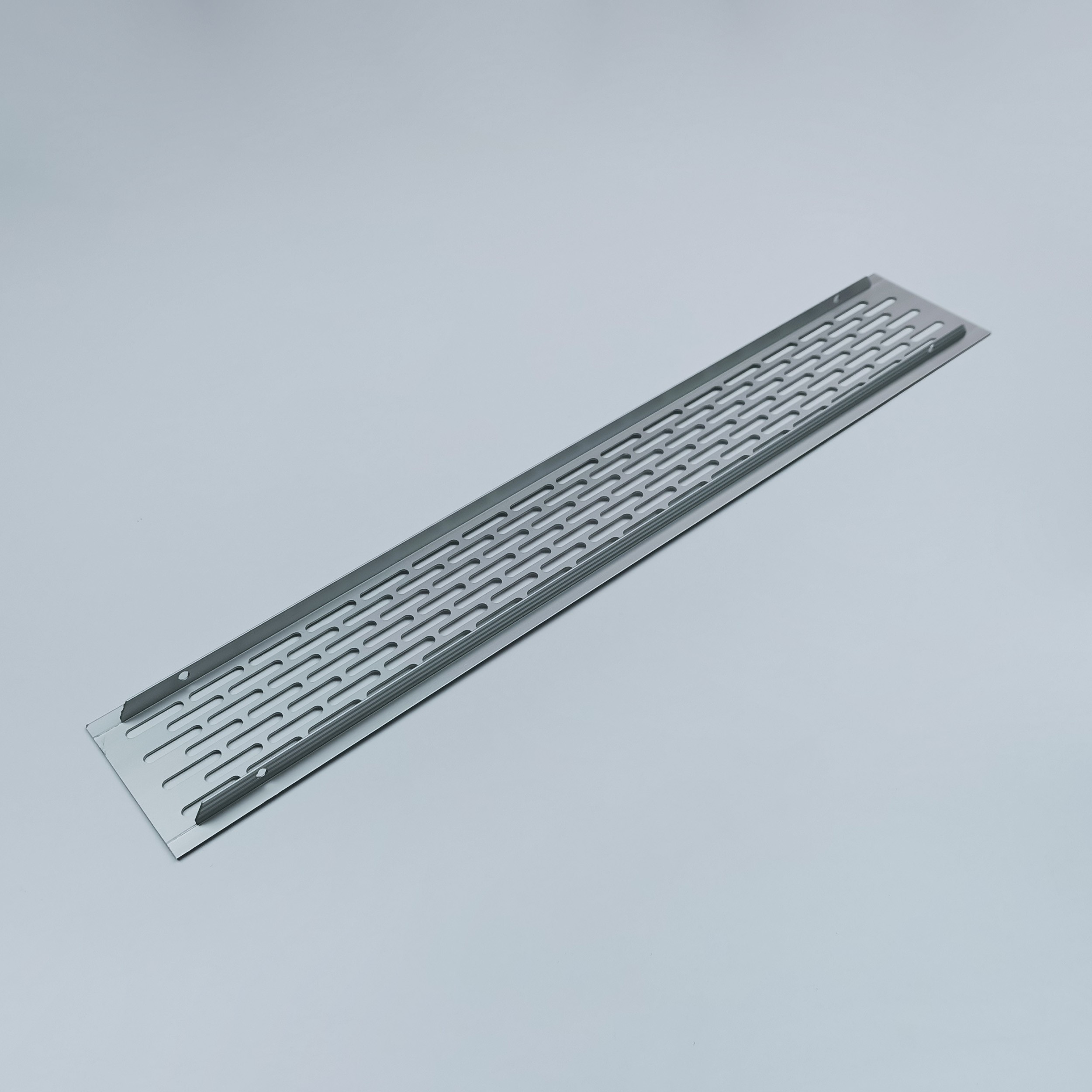 Прямоугольная вентиляционная решетка с прорезями, рифлеными перемычками и видимыми кромками с фаской. Вентиляционная решетка изготовлена из алюминия с анодированной поверхностью серебристого цвета.