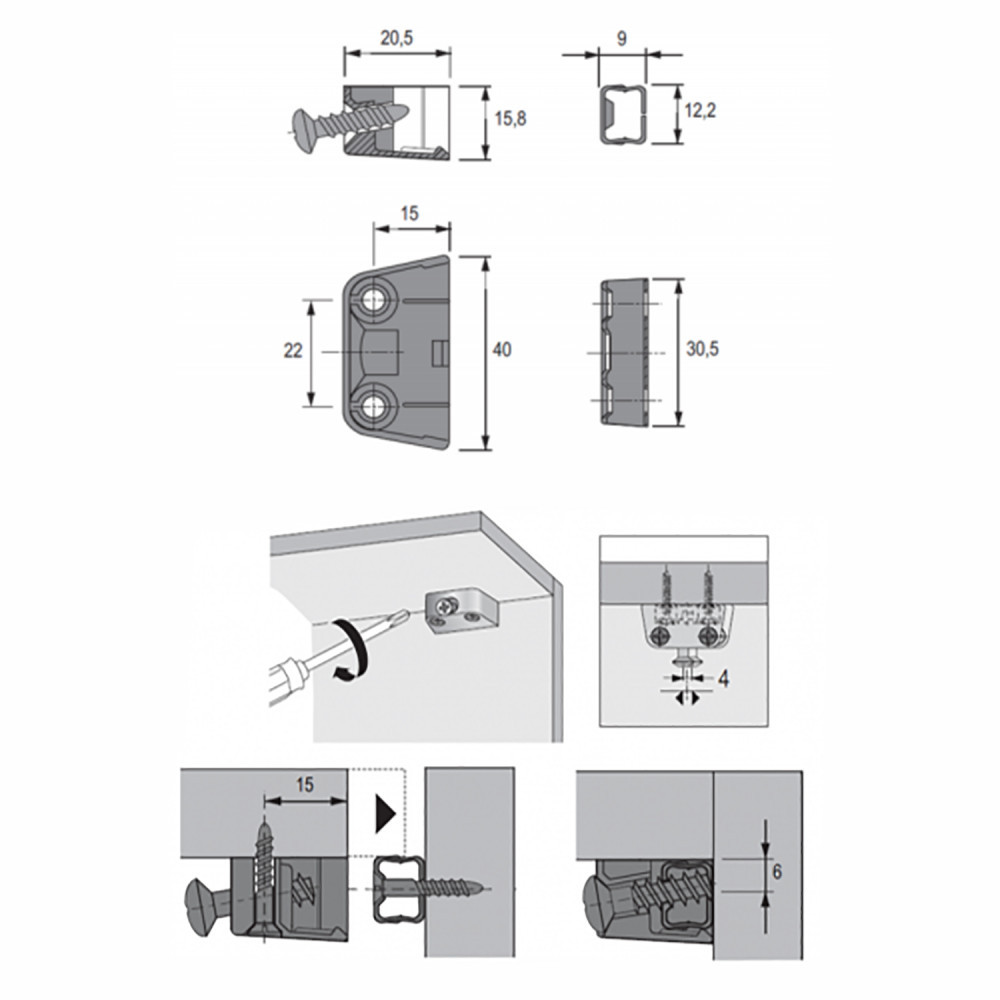С предустановленным шурупом. Простой монтаж через фиксатор верхнего элемента. Разбухание/усадка массивной древесины компенсируется в диапазоне 4 мм с помощью продольного паза.